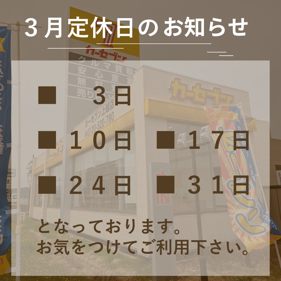 カーセブン宇都宮戸祭店をご利用いただきありがとうございます。 3月の定休日について、下記の通りお知らせいたします ご予...
