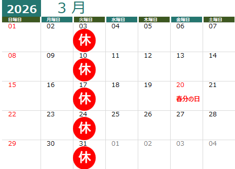 2026.02.26お知らせ【2026年3月の定休日】