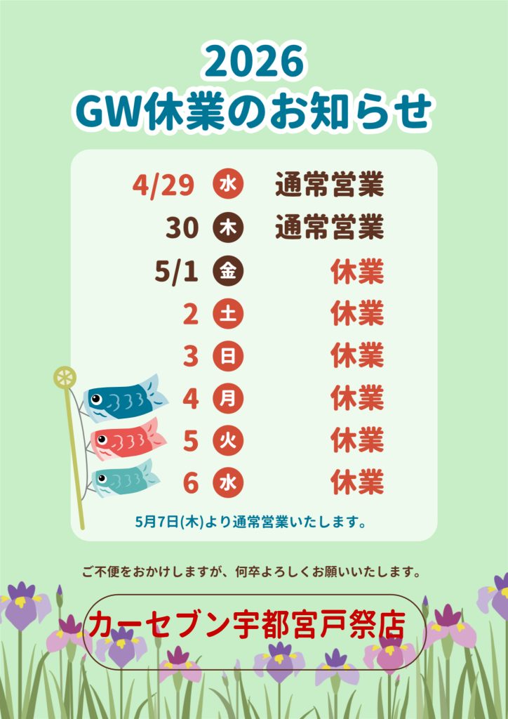 いつもカーセブン宇都宮戸祭店をご利用いただき、誠にありがとうございます 4月・5月の定休日について、下記の通りお知らせいたします ...