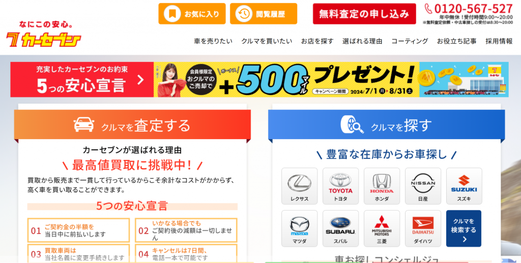 | カーセブン | 安心宣言を掲げ、減額やキャンセル料の心配がない。JPUC認定店。 |