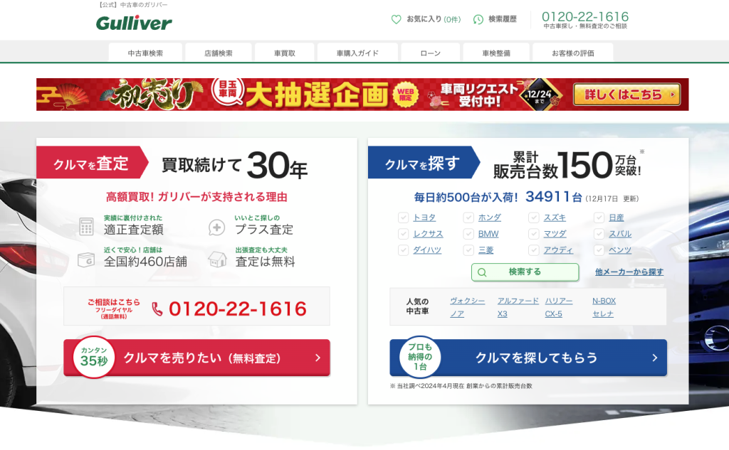 | ガリバー | 全国約460店舗のネットワークと豊富な販売チャネルが強み。 |