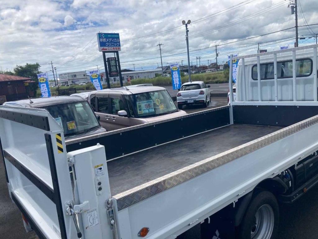 セーフティローダーとは、自動車やバイク、重機などの車両を運搬するためのトラックのことで、荷台がスライドすることで積みおろしをします。主に、工事現場で活躍するトラックです。