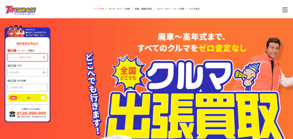 | ティーバイティーガレージ | ・ゼロ査定なしでどんな車も買取・出張査定 ・引き取り・手続きすべて無料 ・その場で10分のスピード査定 |