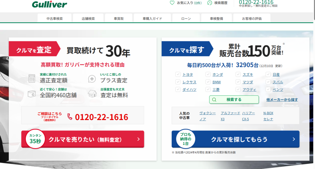 ガリバーは、買取を30年続けてきた確かな実績をもち、累計取引台数は550万台以上にのぼります。全国に約460店舗を展開し、毎日約500台が入荷しています。