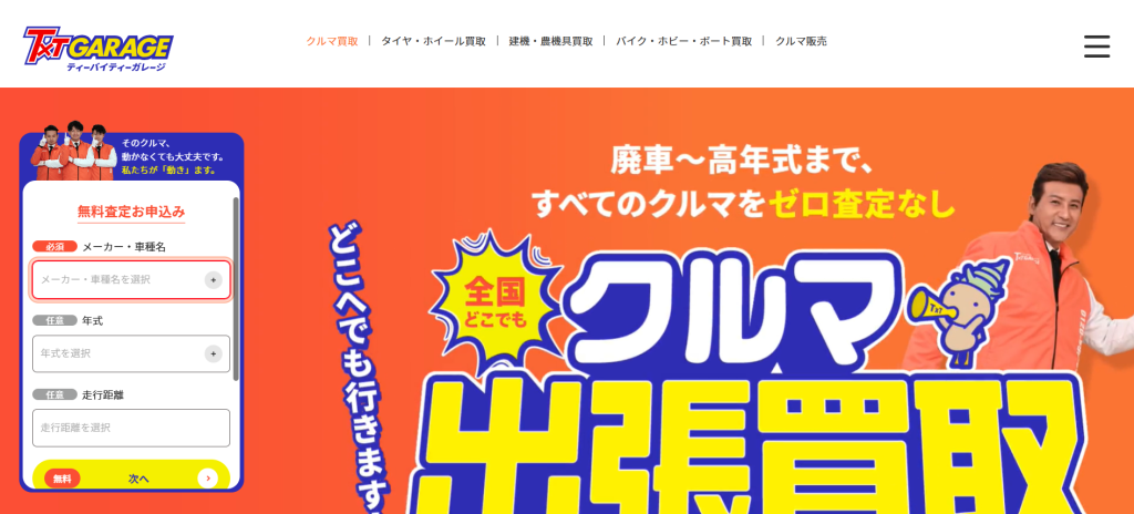 | ティーバイティーガレージ | 出張買取をメインとしており、動かない車や車検切れの車の買取も可能。 |