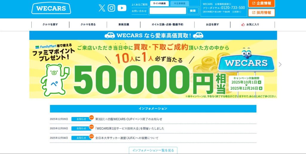 | WECARS | ・自社で買取や販売をしているため査定額が高くなりやすい ・全国250店舗展開しているためネットワークが充実している・契約後の減額なし |