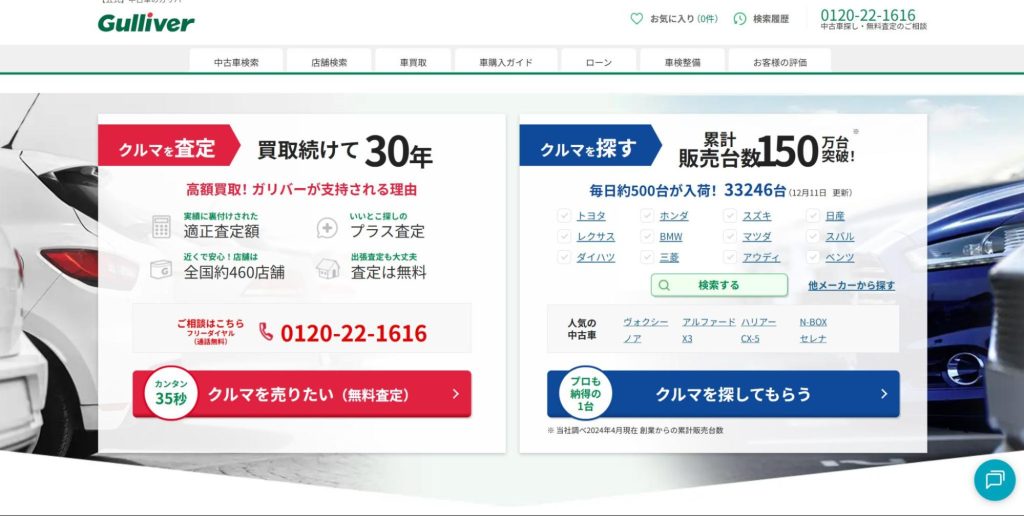 | ガリバー | ・全国に約460店舗以上展開しており査定のノウハウがある・無料オンライン査定で概算がわかる・買取実績が30年ある |