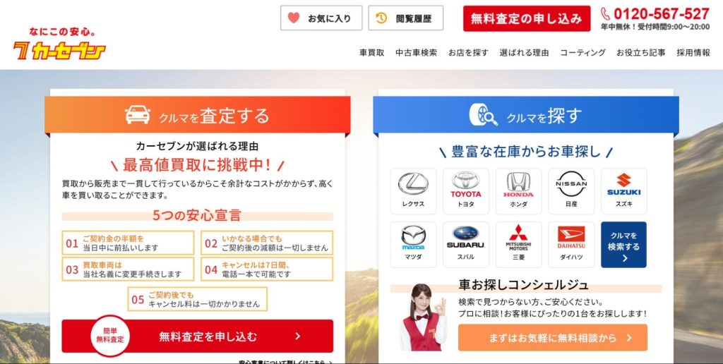 カーセブンは、中古車買取と販売を行う全国展開している大手の買取業者です。利用者が安心して車を売却できるよう「5つの安心宣言」を掲げ、初めて車を売却する場合でもトラブルを避けやすい環境に整えています。
