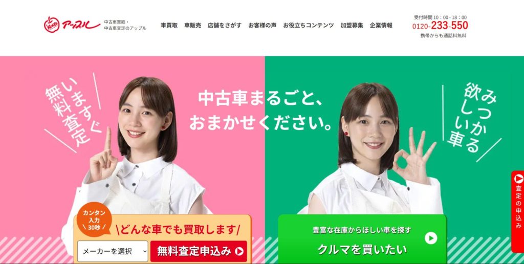 | アップル | ・しつこい営業がなく安心して相談できる・査定金額や書類について納得いく説明をしてもらえる・幅広い車種やメーカーに対応している |