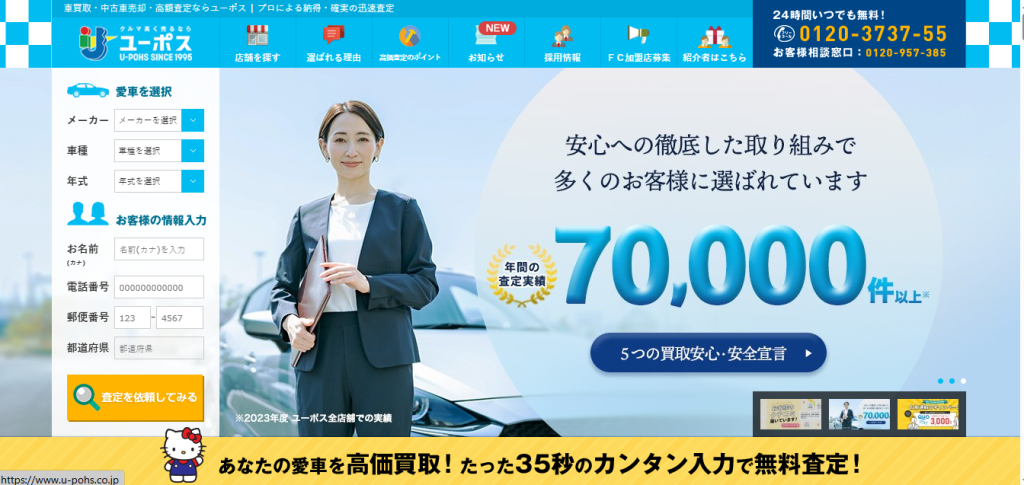 プロの査定士が在籍しており、いいとこ探しのプラス査定を目指しています。サービス内容も多数あり、たとえば車の査定方法だけでも、出張査定や電話査定など自分にあった査定方法を選ぶことが可能です。全国的に知名度も高く安心して取引できるでしょう。