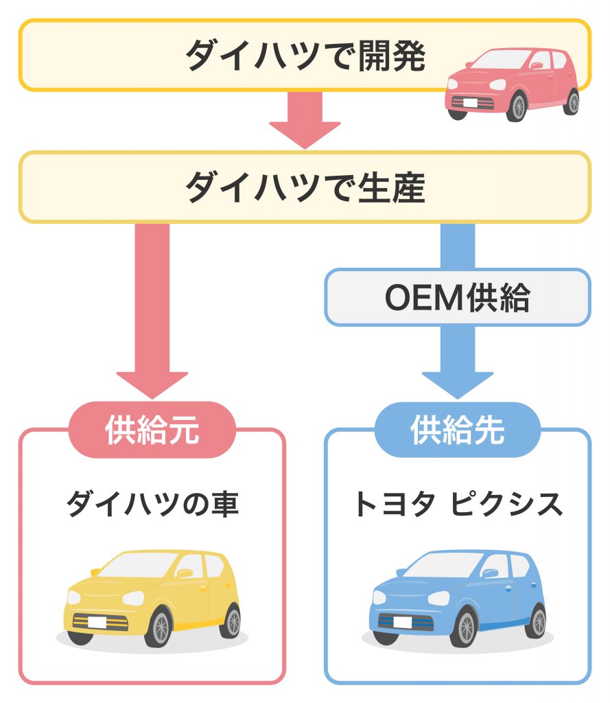 OEMとは「Original Equipment Manufacturing」の略であり、他社ブランドの製品を自社で製造することです。ピクシスシリーズでいうと、ダイハツが製造・販売する軽自動車を、トヨタが自社で「ピクシス」として販売することがOEMとなります。