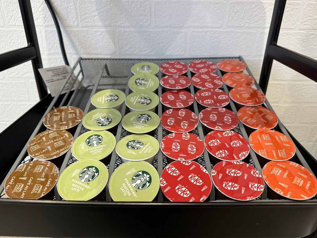 今あるカプセルはこちらのラインナップになります😊キットカットはココアみたいな甘いいい匂いがしました🥰🥰みんな大好きスタバシリーズからは抹茶ラテ🍵あとは定番のカフェラテやレギュラーブレンドがございます☕✨スタッフみんな使用したことがなかったのでさっそく試しにレギュラーブレンドを作って飲んでみました☕さすがネスカフェ❕おいしいです😊ブラックは飲めないのでミルクとお砂糖はしっかり使わせてもらいました😓💦
