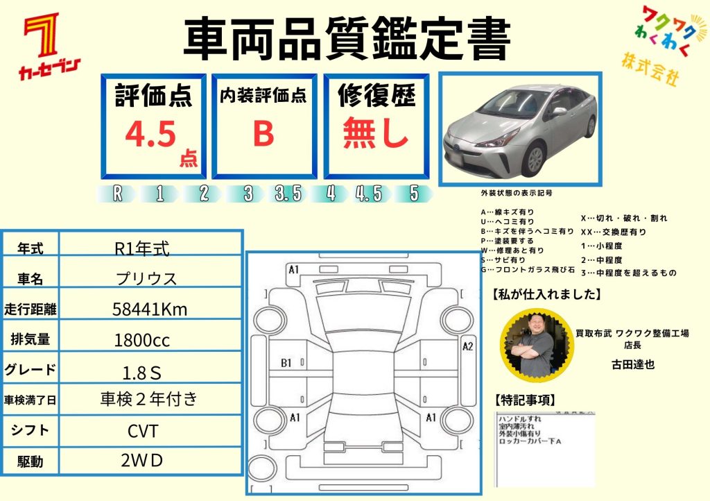 トヨタ プリウス S カーセブン名古屋北店2025.04.13 (初度登録):R1年式次の車検年:車検2年付き走行距離:78476Km車体色:シルバーMその他:結果を「公開」!第三者機関2社の検査・OBD診断済・法定点検整備済